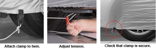 The kit includes components to make two adjustable security cords that clamp to the hem in front of the front tires and behind the rear tires.